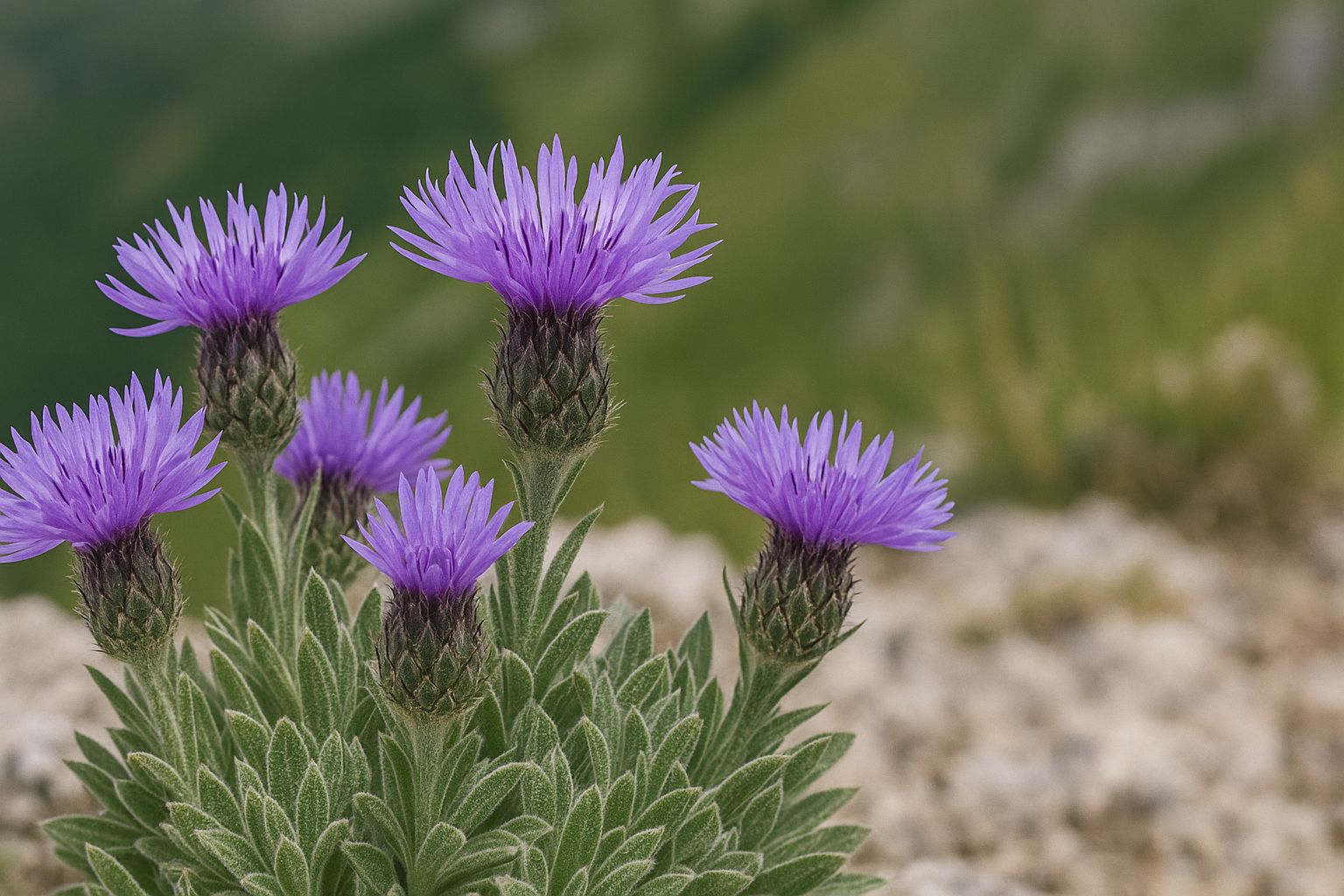 Descrizione: Pianta erbacea montana con capolini viola-lilla e foglie grigio-verdi. Fiorisce da giugno ad agosto su rupi, pascoli aridi e pendii rocciosi.