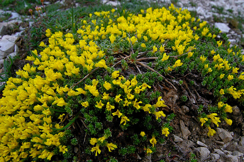 Descrizione: Minuscola perenne alta fino a 4 cm, forma pulvini compatti con foglie lineari, pelose sotto. Fiori gialli con tubo cilindrico e lobi arrotondati, presenti tra giugno e luglio. Vive in ambienti pietrosi d’alta quota.